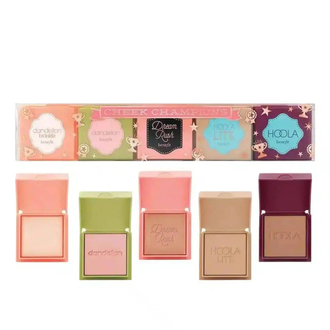 Conquer your cheeks with the Benefit Cheek Champions Mini Set - Blush Highlighter Duo, a must-have collection for makeup enthusiasts seeking flawless, on-the-go looks! This pocket-sized set features five fan-favorite face powders that allow you to unleash your creativity and enhance your natural beauty wherever you are.