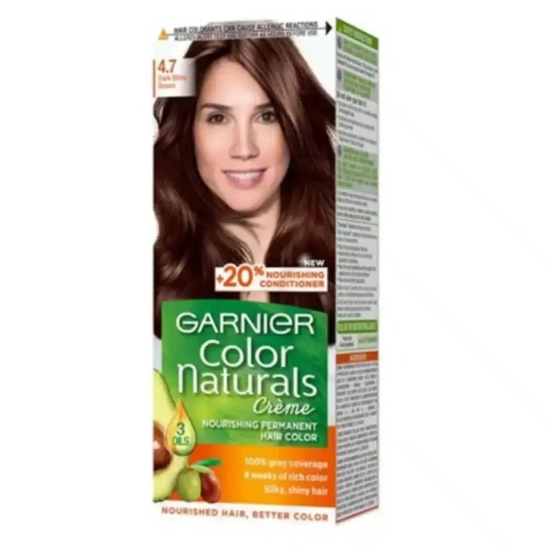 Elevate your hair game with Garnier Color Naturals 4.7 Dark Shiny Brown. This luxurious shade is more than just a color; it's a way to express your unique style. Transform your look and let your hair shine with the rich brilliance that Garnier is known for. Start your journey to beautiful, vibrant hair today!